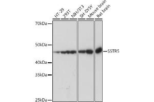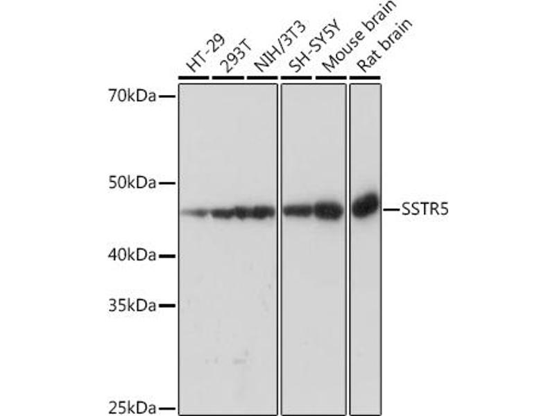 Somatostatin and its related peptide cortistatin exert multiple biological actions on normal and tumoral tissue targets by interacting with somatostatin receptors (SSTRs). The protein encoded by this gene is one of the SSTRs, which is a multi-pass membrane protein and belongs to the G-protein coupled receptor 1 family. The activity of this receptor is mediated by G proteins which inhibit adenylyl cyclase, and different regions of this receptor molecule are required for the activation of different signaling pathways. A mutation in this gene results in somatostatin analog resistance. Alternatively spliced transcript variants have been identified in this gene.[provided by RefSeq, Feb 2010],SS-5-R,G protein signaling,G protein signaling_G-Protein-Coupled Receptors(GPCR),Neuroscience,Signal Transduction,SSTR5