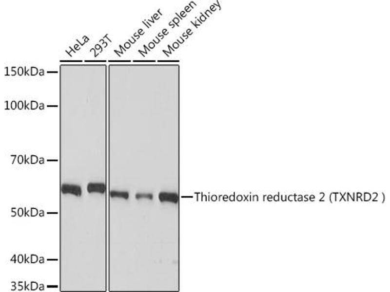 This gene encodes a member of the class I pyridine nucleotide-disulfide oxidoreductase family. The encoded protein is a selenocysteine-containing flavoenzyme that maintains thioredoxins in a reduced state, thereby playing a key role in regulating the cellular redox environment. Mammals have three related thioredoxin reductases. This gene encodes a mitochondrial form important for scavenging of reactive oxygen species in mitochondria. Alternatively spliced transcript variants encoding different isoforms have been described. [provided by RefSeq, Sep 2013],SELZ, TR, TR-BETA, TR3, TRXR2,Cell Biology & Developmental Biology,Endocrine & Metabolism,TXNRD2