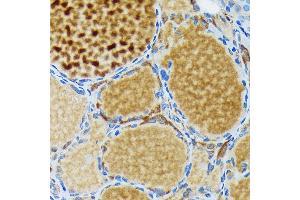 - This gene encodes a membrane-bound glycoprotein. The encoded protein acts as an enzyme and plays a central role in thyroid gland function. The protein functions in the iodination of tyrosine residues in thyroglobulin and phenoxy-ester formation between pairs of iodinated tyrosines to generate the thyroid hormones, thyroxine and triiodothyronine. Mutations in this gene are associated with several disorders of thyroid hormonogenesis, including congenital hypothyroidism, congenital goiter, and thyroid hormone organification defect IIA. Multiple transcript variants encoding distinct isoforms have been identified for this gene, but the full-length nature of some variants has not been determined. [provided by RefSeq, May 2011],MSA, TDH2A, TPX,Cancer,Cell Biology & Developmental Biology,Endocrine & Metabolism,Growth factors,Neuroscience,Signal Transduction,TPO