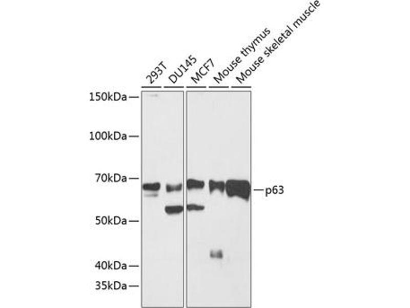 - This gene encodes a member of the p53 family of transcription factors. The functional domains of p53 family proteins include an N-terminal transactivation domain, a central DNA-binding domain and an oligomerization domain. Alternative splicing of this gene and the use of alternative promoters results in multiple transcript variants encoding different isoforms that vary in their functional properties. These isoforms function during skin development and maintenance, adult stem/progenitor cell regulation, heart development and premature aging. Some isoforms have been found to protect the germline by eliminating oocytes or testicular germ cells that have suffered DNA damage. Mutations in this gene are associated with ectodermal dysplasia, and cleft lip/palate syndrome 3 (EEC3), split-hand/foot malformation 4 (SHFM4), ankyloblepharon-ectodermal defects-cleft lip/palate, ADULT syndrome (acro-dermato-ungual-lacrimal-tooth), limb-mammary syndrome, Rap-Hodgkin syndrome (RHS), and orofacial cleft 8. [provided by RefSeq, Aug 2016],AIS,B(p51A),B(p51B),EEC3,KET,LMS,NBP,OFC8,RHS,SHFM4,TP53CP,TP53L,TP73L,p40,p51,p53CP,p63,p73H,p73L,TP63,Apoptosis,Cancer,Cell Biology & Developmental Biology,Epigenetics & Nuclear Signaling,Stem Cells,Transcription Factors,Tumor suppressors,Tumor suppressors_p53 pathway,TP63