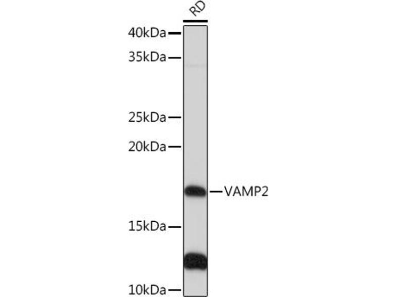 The protein encoded by this gene is a member of the vesicle-associated membrane protein (VAMP)/synaptobrevin family. Synaptobrevins/VAMPs, syntaxins, and the 25-kD synaptosomal-associated protein SNAP25 are the main components of a protein complex involved in the docking and/or fusion of synaptic vesicles with the presynaptic membrane. This gene is thought to participate in neurotransmitter release at a step between docking and fusion. The protein forms a stable complex with syntaxin, synaptosomal-associated protein, 25 kD, and synaptotagmin. It also forms a distinct complex with synaptophysin. It is a likely candidate gene for familial infantile myasthenia (FIMG) because of its map location and because it encodes a synaptic vesicle protein of the type that has been implicated in the pathogenesis of FIMG. [provided by RefSeq, Jul 2008],SYB2, VAMP-2,Cancer,Cell Type Marker,Cell Type Marker_Neuron marker,Cell Type Marker_Synapse marker,Endocrine & Metabolism,Neuroscience,Signal Transduction,VAMP2