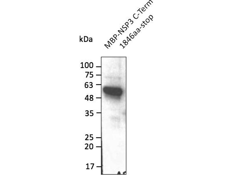 - Affinity purified recombinant fusion protein using the C-terminal of Nsp3 (residues 1846 to stop) and produced in E. coli.