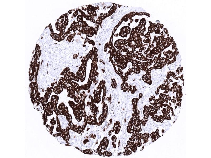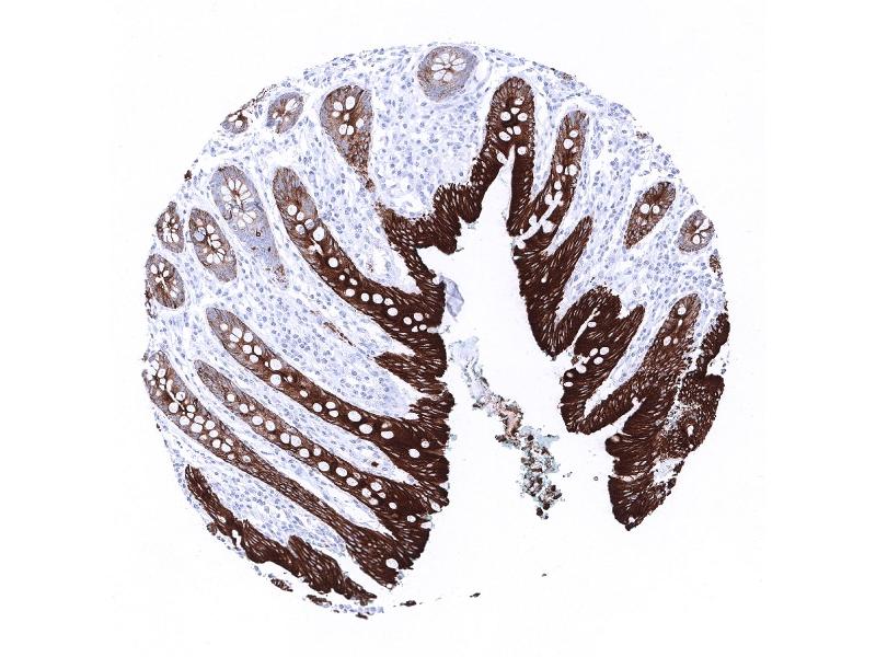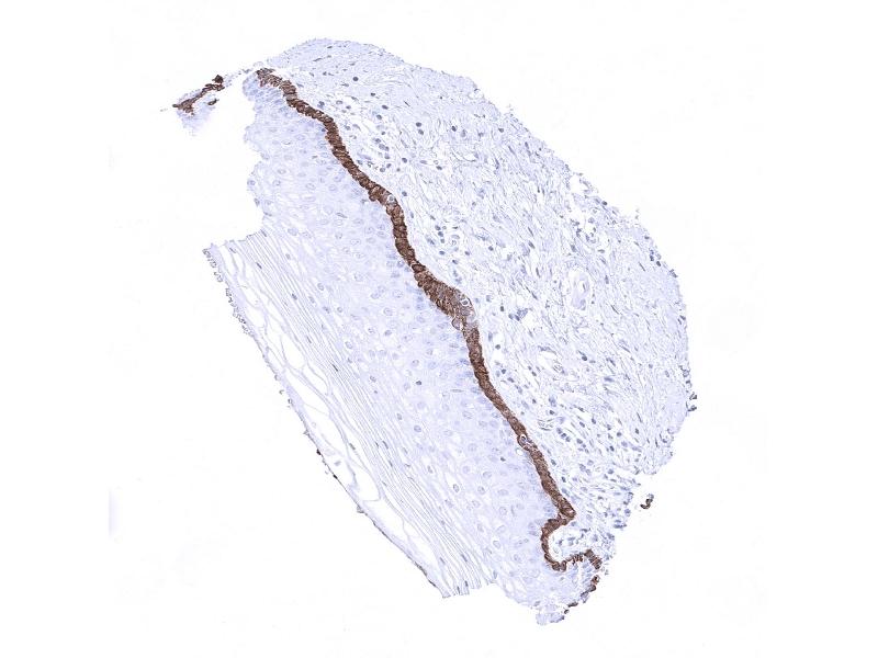 Positive Control: Colon: A strong immunostaining is seen in all epithelial cells. Tonsil: A moderate to strong immunostaining occurs in the basal cell layer of the squamous epithelium of the tonsil surface.