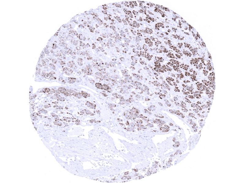 - Manual Protocol: Freshly cut sections should be used (less than 10 days between cutting and staining). Heat-induced antigen retrieval for 5 minutes in an autoclave at 121 °C in pH 7,8 Target Retrieval Solution buffer. Apply the antibody at a dilution of 1:75 at 37 °C for 60 minutes. Visualization of bound antibody by the EnVision Kit (Dako, Agilent) according to the manufacturer's directions.