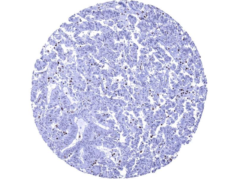 Negative Control: Colon adenocarcinoma with previously documented loss of MSH6 expression: Nuclear staining should be absent in cancer cells, while a nuclear staining must be seen in stromal and inflammatory cells.