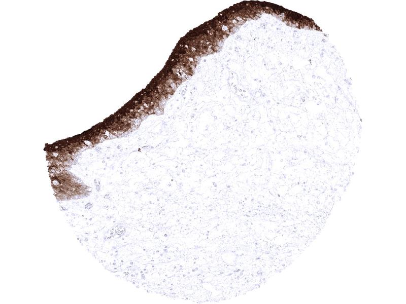 Positive Control: Urinary bladder: A strong S100P immunostaining should be seen in the urothelium but not in the stroma or muscular cells.