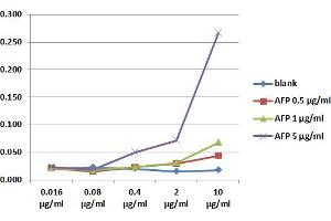 ELISA: The antibody AFP-01 has been tested as the detection antibody in a sandwich ELISA for analysis of human alpha-fetoprotein in combination with antibody AFP-11 (cat. no. 11-384-C100). Western blotting: Recommended dilution: 1-2 μg/mL, non-reducing conditions. Immunoprecipitation: Interaction of the antibody AFP-01 with AFP is dependent on the presence of calcium ions (strongly inhibited by chelating agents). Such characteristics of the antibody can be exploited for immunoaffinity purification of APF under mild elution conditions.