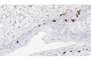 Immunohistochemistry on paraffin sections. Heat Induced Epitope Retrieval (HIER): Epitope Retrieval Solution pH 6. Suggested dilution: 1:50 for 30 minutes at 25 °C. This is provided as a guide and users should determine their own optimal working dilutions. Immunohistochemical (IHC) staining techniques allow for the visualization of antigens via the sequential application of a specific antibody to the antigen (primary antibody), a secondary antibody to the primary antibody and an enzyme complex with a chromogenic substrate with interposed washing steps. The enzymatic activation of the chromogen results in a visible reaction product at the antigen site. The specimen may then be counterstained and coverslipped. Results are interpreted using a light microscope.
