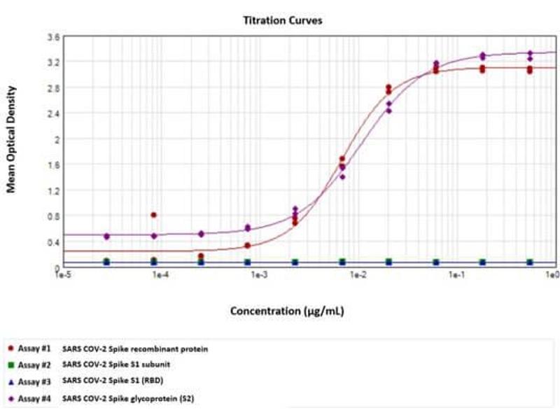 Anti-SARS-CoV-2 Whole Spike protein antibody has been tested for use in ELISA and shows reactivity to SARS COV-2 Whole Spike and COV-2 Spike (S2) protein. Specific conditions for reactivity should be optimized by the end user.