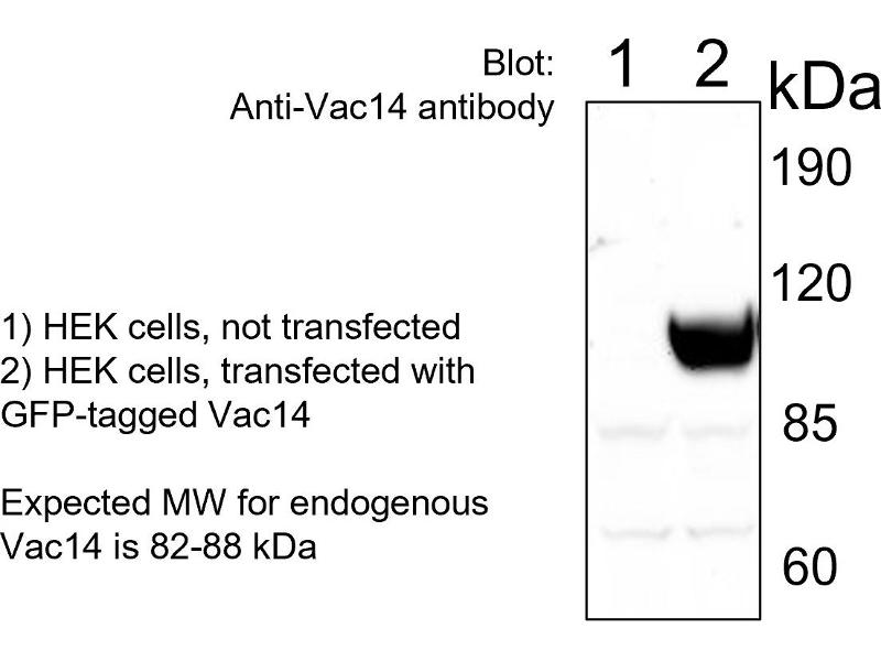 The Vac14 antibody is directed at an C-terminal region of Vac14 and detects mammalian forms of Vac14 with an expected molecular weight of approximately 82-88 kDa.