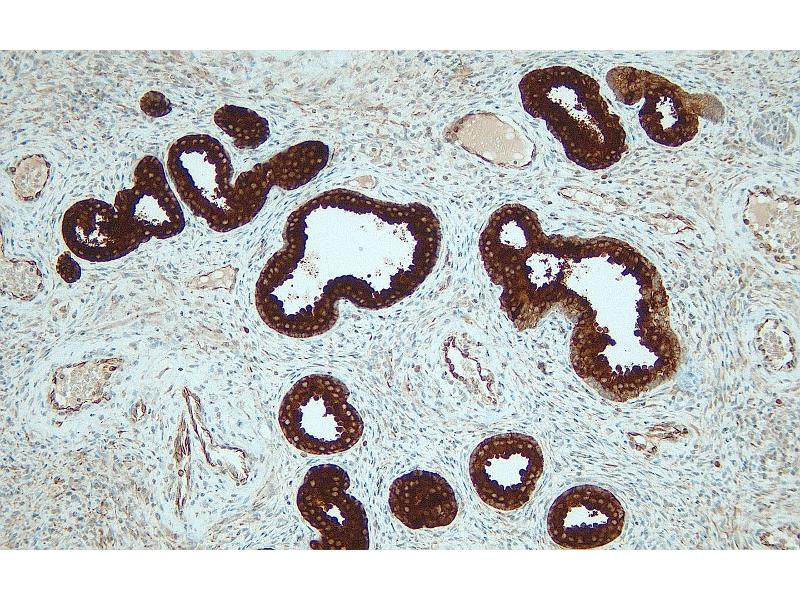 PSA represents a prostate cancer protein marker, strongly expressed in both normal and neoplastic prostatic tissue. This protein is expressed at lower levels also in in breast tumors, endometrium, or renal cell carcinomas. Together with Prostate-Specific Acid Phosphatase (PSAP), PSA expression is detected in blood samples and/or prostate tissue-related biopsies, in order to confirm the prostatic origin of metastatic carcinoma.
