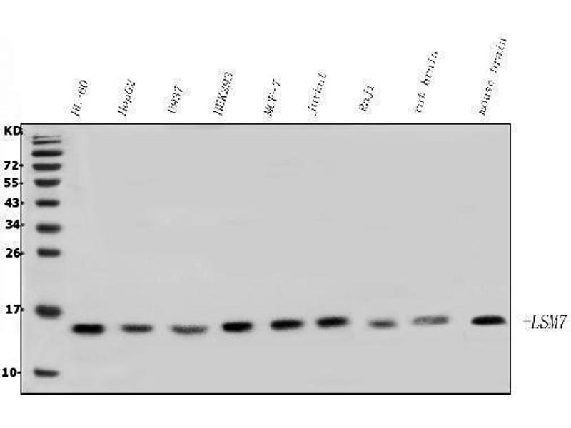 Background: U6 snRNA-associated Sm-like protein LSm7 is a protein that in humans is encoded by the LSM7 gene. Sm-like proteins were identified in a variety of organisms based on sequence homology with the Sm protein family (see SNRPD2, MIM 601061). Sm-like proteins contain the Sm sequence motif, which consists of 2 regions separated by a linker of variable length that folds as a loop. The Sm-like proteins are thought to form a stable heteromer present in tri-snRNP particles, which are important for pre-mRNA splicing.