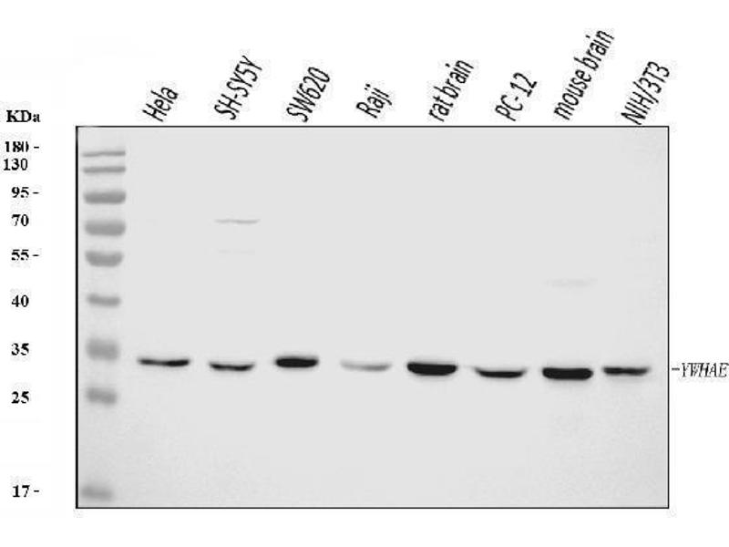 Background: 14-3-3 protein epsilon is a protein that in humans is encoded by the YWHAE gene. This gene product belongs to the 14-3-3 family of proteins which mediate signal transduction by binding to phosphoserine-containing proteins. This highly conserved protein family is found in both plants and mammals, and this protein is 100 % identical to the mouse ortholog. It interacts with CDC25 phosphatases, RAF1 and IRS1 proteins, suggesting its role in diverse biochemical activities related to signal transduction, such as cell division and regulation of insulin sensitivity. It has also been implicated in the pathogenesis of small cell lung cancer. Two transcript variants, one protein-coding and the other non-protein-coding, have been found for this gene.