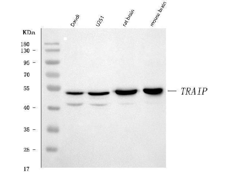 Background: TRAF-interacting protein is a protein that in humans is encoded by the TRAIP gene. This gene encodes a protein that contains an N-terminal RING finger motif and a putative coiled-coil domain. A similar murine protein interacts with TNFR-associated factor 1 (TRAF1), TNFR-associated factor 2 (TRAF2), and cylindromatosis. The interaction with TRAF2 inhibits TRAF2-mediated nuclear factor kappa-B, subunit 1 activation that is required for cell activation and protection against apoptosis.