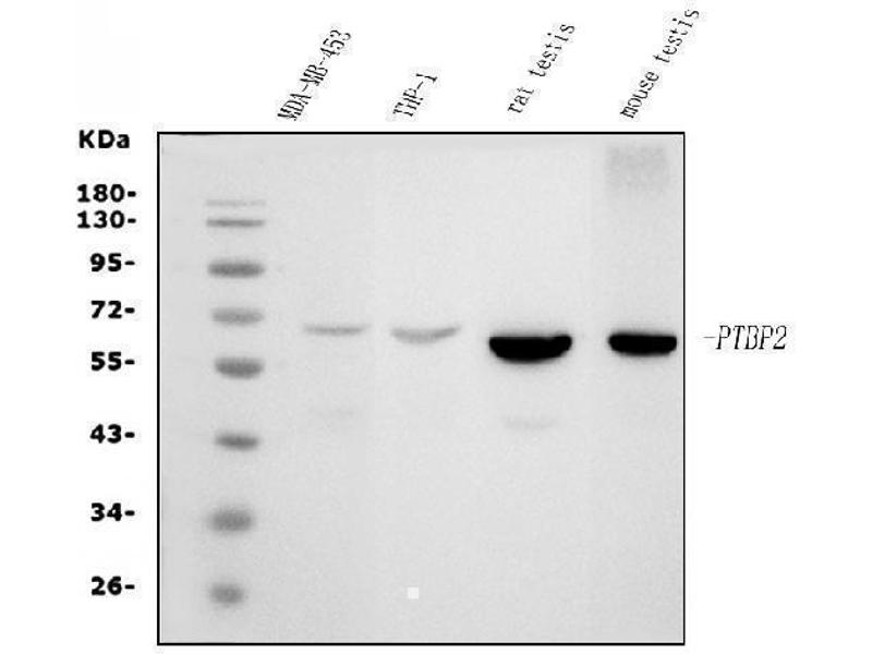 Background: Polypyrimidine tract binding protein 2, also known as PTBP2, is a protein which in humans is encoded by the PTBP2 gene. It is mapped to 1p21.3. The protein encoded by this gene binds to intronic polypyrimidine clusters in pre-mRNA molecules and is implicated in controlling the assembly of other splicing-regulatory proteins. This protein is very similar to the polypyrimidine tract binding protein (PTB) but most of its isoforms are expressed primarily in the brain. Alternative splicing results in multiple transcript variants.