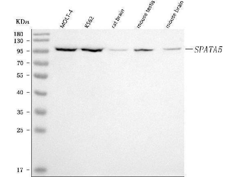 - Anti-SPATA5 Antibody (ABIN7599767). Tested in ELISA, Flow Cytometry, WB applications. This antibody reacts with Human, Mouse, Rat. This is a premium antibody that guarantees superior quality, high affinity, and strong signals with minimal background in Western blot applications.