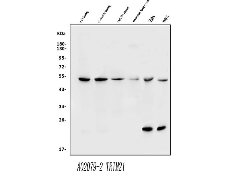 Synonyms: E3 ubiquitin-protein ligase TRIM21, 52 kDa Ro protein, 52 kDa ribonucleoprotein autoantigen Ro/SS-A, RING finger protein 81, RING-type E3 ubiquitin transferase TRIM21, Ro (SS-A), Sjoegren syndrome type A antigen, SS-A, Tripartite motif-containing protein 21, TRIM21, RNF81, RO52, SSA1