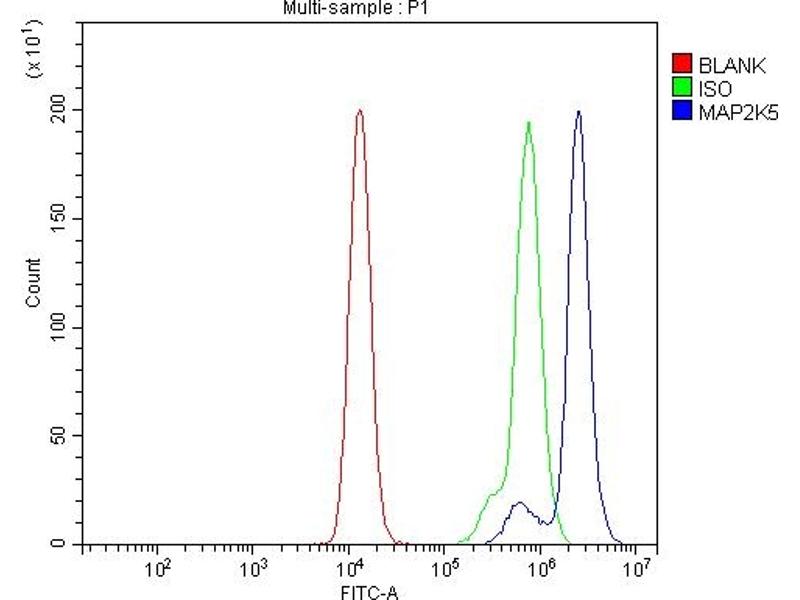 Background: Apoptosis signal-regulating kinase 1 (ASK1) also known as mitogen-activated protein kinase 5 (MAP3K5) is a member of MAP kinase family and as such a part of mitogen-activated protein kinase pathway. Mitogen-activated protein kinase (MAPK) signaling cascades include MAPK or extracellular signal-regulated kinase (ERK), MAPK kinase (MKK or MEK), and MAPK kinase kinase (MAPKKK or MEKK). MAPKK kinase/MEKK phosphorylates and activates its downstream protein kinase, MAPK kinase/MEK, which in turn activates MAPK. The kinases of these signaling cascades are highly conserved, and homologs exist in yeast, Drosophila, and mammalian cells. MAPKKK5 contains 1,374 amino acids with all 11 kinase subdomains. Northern blot analysis shows that MAPKKK5 transcript is abundantly expressed in human heart and pancreas. The MAPKKK5 protein phosphorylates and activates MKK4 (aliases SERK1, MAPKK4) in vitro, and activates c-Jun N-terminal kinase (JNK)/stress-activated protein kinase (SAPK) during transient expression in COS and 293 cells, MAPKKK5 does not activate MAPK/ERK.