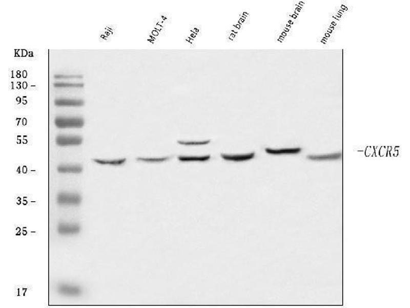 - Anti-CXCR5 Antibody (ABIN7600362). Tested in ELISA, Flow Cytometry, WB applications. This antibody reacts with Human, Mouse, Rat. This is a premium antibody that guarantees superior quality, high affinity, and strong signals with minimal background in Western blot applications.