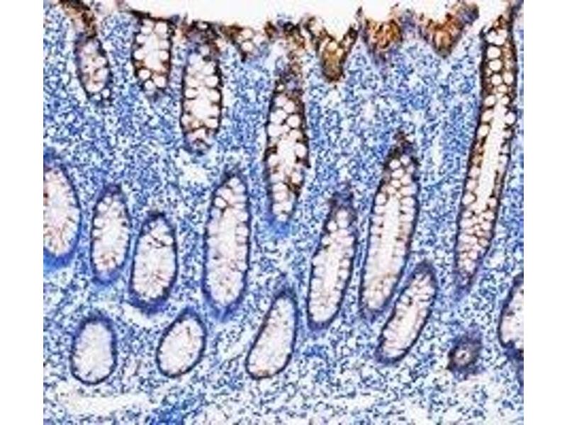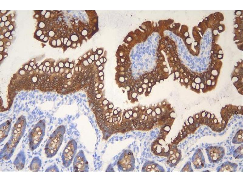 Tissue Specificity: Expressed at low levels in the more differentiated suprabasal regions of the small intestine, and at higher levels in the colon, mainly in the upper region and in scattered cells throughout the remaining epithelium. Also expressed in epithelial cells of bladder, ileum and stomach and at lower levels in pancreas and earskin. The phosphorylated form is nearly exclusively expressed in goblet cells of the small intestine and in the lumen-proximal cells of the colon (at protein level). Also expressed in jejunum and duodenum.
