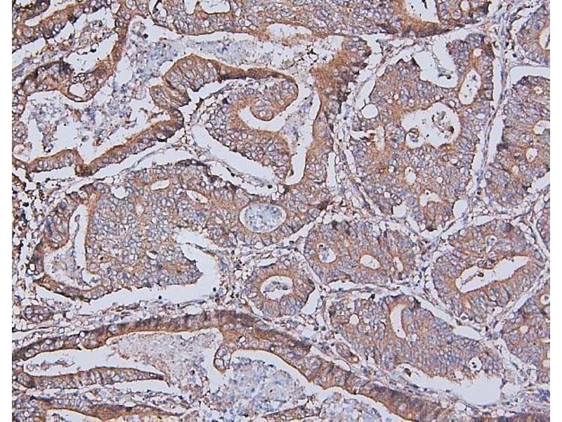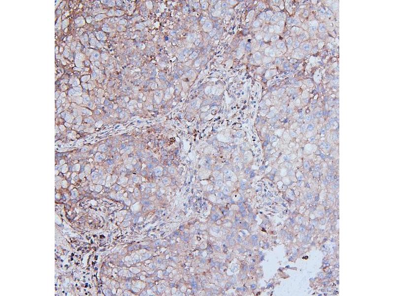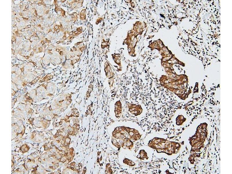 Tissue Specificity: Detected in T-47D, MDA-MB-175 and HBL-100 breast carcinoma cells, A-431 epidermoid carcinoma cells, SW48 and SNU-C2B colon carcinoma cells and Hs 294T melanoma cells (at protein level). Expressed at low levels in most adult tissues and is highest in the brain, lung, placenta and kidney. Lower levels of expression are detected in melanocytes, heart, liver, skeletal muscle and pancreas. Abundant in breast carcinoma cell lines. In the colonic mucosa, expressed in epithelia but not in the connective tissue of the lamina propria. In the thyroid gland, expressed in the epithelium of the thyroid follicles. In pancreas, expressed in the islets of Langerhans cells, but not in the surrounding epithelial cells of the exocrine pancreas. In kidney, expressed in the epithelia of the distal tubules. Not expressed in connective tissue, endothelial cells, adipose tissue, muscle cells or cells of hematopoietic origin.