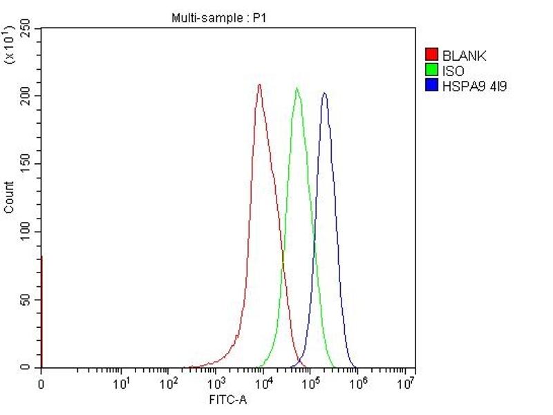 Background: HSPA9 (heat shock 70 kDa protein 9 (mortalin)), also known as GRP75, mot-2, mthsp75, PBP74, HSPA9B, MORTALIN or MORTALIN, PERINUCLEAR, is a highly conserved member of the HSP70 family of proteins. It functions as a chaperone in the mitochondria, cytoplasm, and centrosome. The HSPA9 gene is mapped to chromosome 5q31.2 based on an alignment of the HSPA9 sequence with the genomic sequence. Knockdown of HSPA9 in erythroid cultures was associated with an increased number of cells in the G0/G1 phase of the cell cycle and accelerated apoptosis. Knockdown of Hspa9 in mouse bone marrow cells, followed by transplantation into wildtype recipients, also resulted in loss of erythroid cell number. Haploinsufficiency for HSPA9 may contribute to abnormal hematopoiesis in myelodysplastic syndromes. This protein plays a role in the control of cell proliferation.