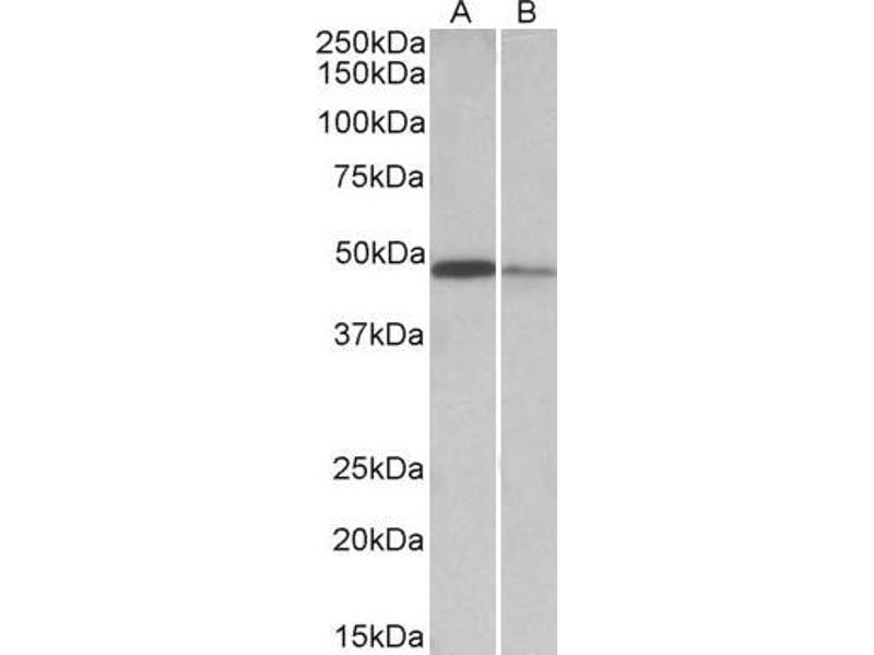 Western Blot: Approx 50 kDa plus faint 35 kDa bands observed in Human Lymph Nodes lysates and 48 kDa in Mouse Lymph Node and in Mouse Intestine lysates (calculated MW of 47.6 kDa according to Human NP_110437.2, 46.4 kDa to Mouse NP_663342.3) and of 36.2 kDa ac