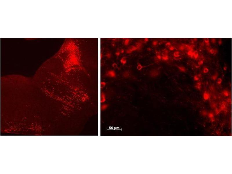 Immunofluorescence: In free-floating samples of Mouse Brain stem staining of Raphe nucleii serotonergic neurons can be seen, that is consistent with observation by different antibodies. Recommended concentration, 0.5-2μg/ml.