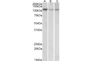 Western Blot: Approx 110 kDa band observed in Human Brain (Cerebellum) (calculated MW of 106 kDa according to NP_056255.2). The same band is observed in lysates of cell line NIH3T3, Mouse Brain and Rat Brain. Recommended concentration: 0.1-0.3 μg/mL. Prima