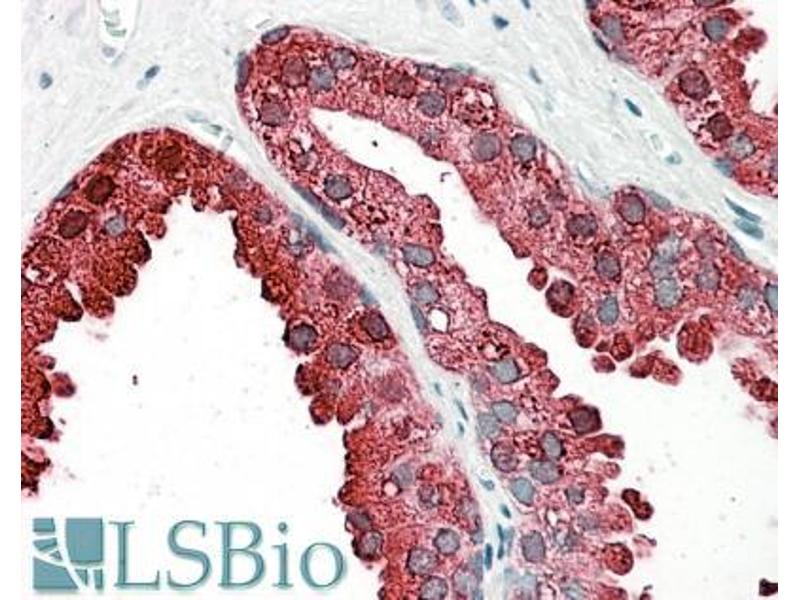 Immunohistochemistry: In paraffin embedded Human Prostate shows reticulate cytoplasm staining, more intens towards the lumen of the gland. Recommended concentration, 3-5 μg/mL.