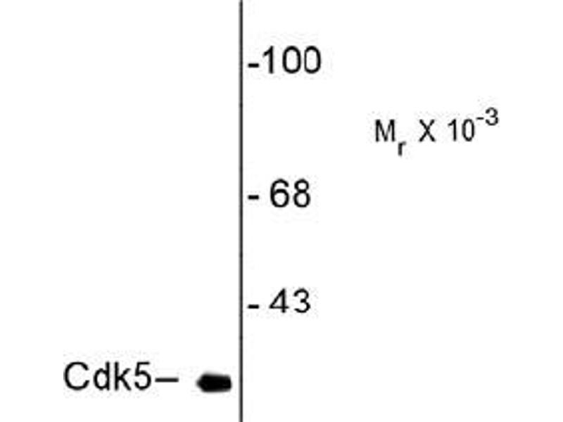 Specific for the ~ 28 kDa Cdk5 protein in Western blots of Rat striatal lysate. The antibody shows no cross reactivity with the CDK5 cofactor p35 or its degradation product p25.
