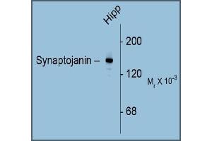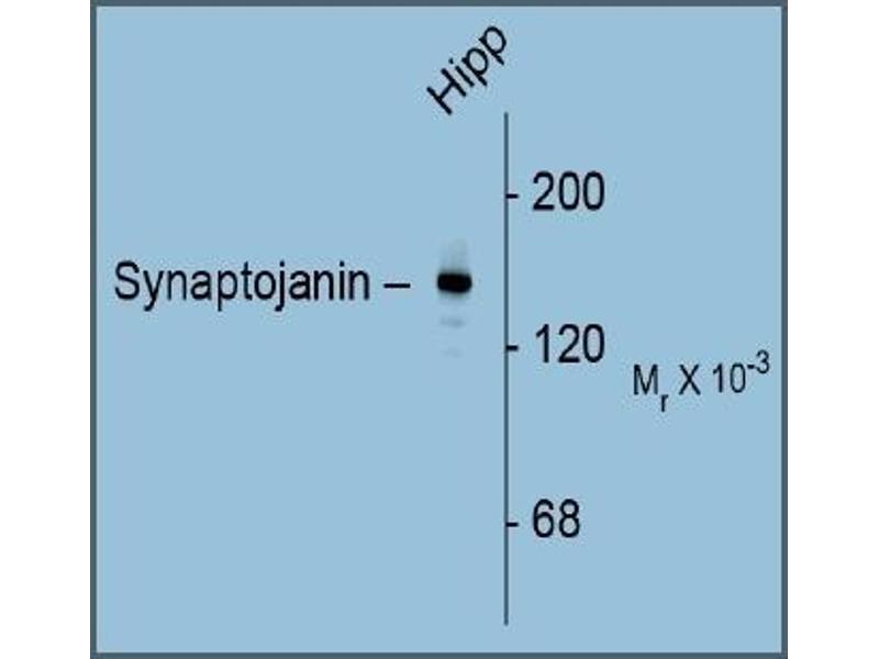 - Specific for the ~145k Synaptojanin I protein in Western blots of Rat brain extracts. Immunolabeling blocked by preadsorption of antibody with the protein used to generate the antibody. Does not cross react with Mouse.
