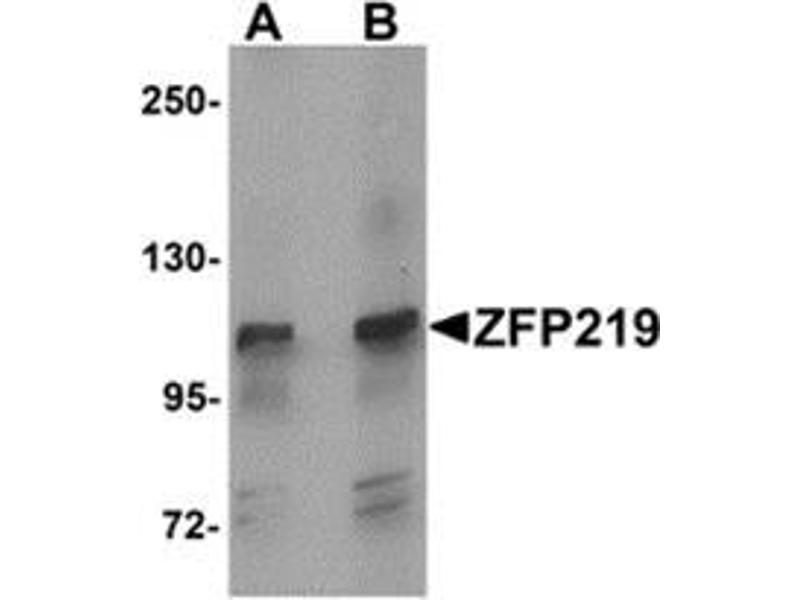 ZFP219 is a developmentally regulated member of the Kruppel-like zinc finger gene family that is thought to function as a transcriptional repressor. Yeast two-hybrid screening showed association with Sox9, a transcription factor that is essential for chondrogenesis. ZFP219 is specifically expressed in the developing limb buds and colocalizes with Sox9 in the nucleus. Knockdown of ZFP219 expression decreased Sox9-induced mRNA expression, and a dominant-negative mutant of ZFP219 inhibited Bmp2-induced chondrocyte differentiation, suggesting that ZFP219 plays an important role as a transcriptional partner of Sox9 in the regulation of chondrocyte differentiation.Synonyms: Zinc finger protein 219
