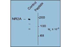 Specific for the ~180k NMDAR NR2A-subunit protein phosphorylated at Tyr1325 in Western blots. Immunolabeling is completely blocked by blocked by the phosphopeptide used as the antigen but not by the corresponding dephosphopeptide.
