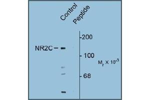 Specific for the ~140k NR2C subunit of the NMDA receptor phosphorylated at Ser1096. Immunolabeling is blocked by preadsorption of antibody with the phospho-peptide that was used to generate the antibody but not by the corresponding dephospho-peptide.