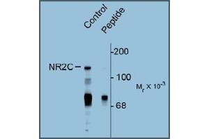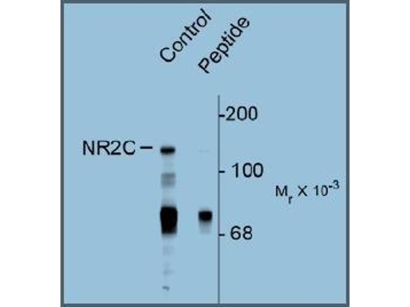 Specific for the ~140k NR2C subunit of the NMDA receptor phosphorylated at Ser1244. Immunolabeling is blocked by preadsorption of antibody with the phospho-peptide that was used to generate the antibody but not by the corresponding dephospho-peptide.