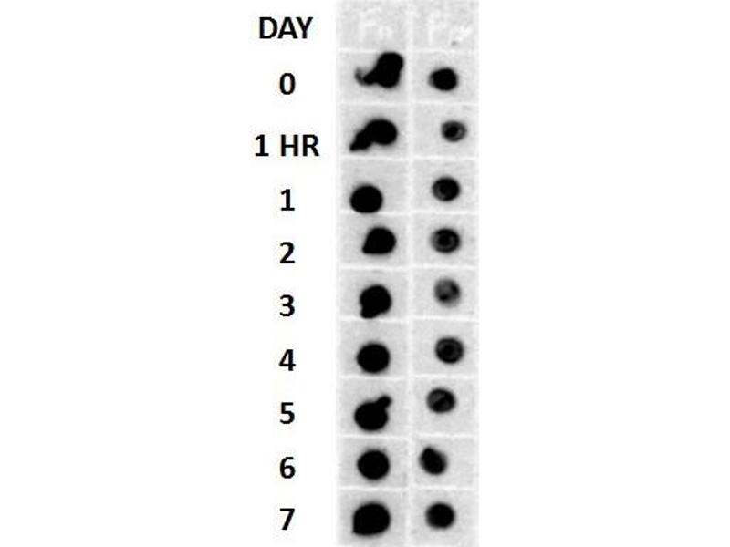 A 1:1000 dilution of ABIN863211 was sufficient for detection of amyloid fibrils on PVDF membranes using transferred fibrils by colorimetric dot blot analysis using Goat anti-rabbit IgG:HRP as the secondary antibody.