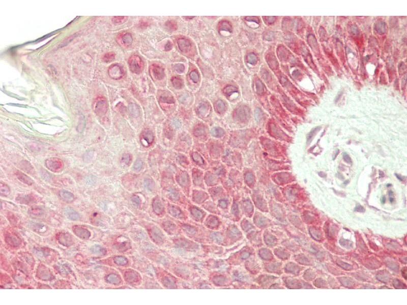 Immunohistochemistry: Paraffin embedded Human Skin. Recommended concentration: 5 μg/mL.