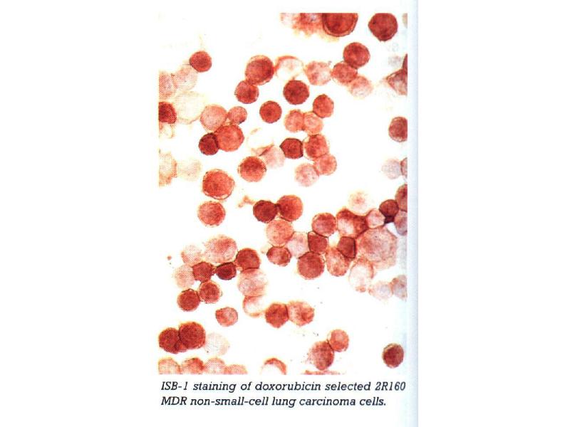 JSB-1 reacts with a conserved cytoplasmic epitope of the human plasma membrane- associated 170-180 kDa glycoprotein, the expression of which is strongly correlated with the degree of multidrug resistance (MDR) derived MDR cell lines and human MDR cell lines, including cell lines derived from lung, ovaries and B cell lymphomas.