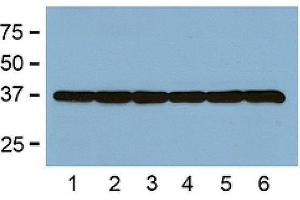 Glyceraldehyde 3-phosphate dehydrogenase (GAPDH) is an enzyme that catalyzes the sixth step of glycolysis and thus serves to break down glucose for energy and carbon molecules. In addition to this long established metabolic function, GAPDH has recently been implicated in several non-metabolic processes, including transcription activation, initiation of apoptosis, and ER to Golgi vesicle shuttling. Synonyms: Monoclonal GAPDH antibody, Anti-GAPDH antibody, Glyceraldehyde-3-phosphate dehydrogenase antibody, GAPDH Loading Control antibody.