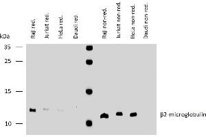 Beta-2-microglobulin,Beta2-microglobulin non-covalently associates with the 44 kDa alpha chain to forms the HLA Class I antigen complex. Human beta2-microglobulin associated with HLA Class I antigens is expressed on many types of cells including lymphocytes, thymocytes, monocytes, granulocytes, platelets, endothelial cells, and epithelial cells. It is absent on erythrocytes.,B2M