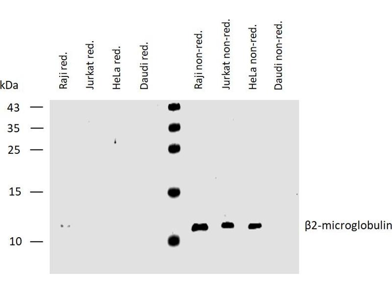 Western blotting: Recommended dilution: 2-4 μg/mL, positive control: U937 human histiocytic lymphoma cell line, RAJI human Burkitt lymphoma cell line, negative control: EL4 mouse lymphoblastic lymphoma cell line, both reducing and non-reducing conditions. Immunohistochemistry (paraffin sections): Recommended dilution: 10 μg/mL, positive tissue: kidney glomeruli. Flow cytometry: Recommended dilution: 0.5-4 μg/mL, positive control: peripheral blood lymphocytes, negative control: DAUDI human Burkitt lymphoma cell line, erythrocytes. ELISA: Working dilution should be determinated by investigator. RIA: Use at an assay dependent concentration. The dissociation constant of the antibody soluble beta2-microglobulin is 1.5 x 10-8 mol/l as determined by competitive RIA. Immunoprecipitation: The antibody B2M-01 coprecipitates beta2-microglobulin (12 kDa) and HLA antigens (45 kDa) from the lysates of human lymphoid cells.