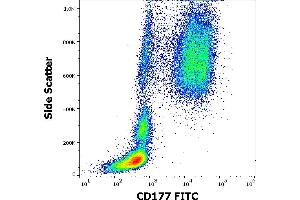 The antibody MEM-166 reacts with CD177 (Neutrophil specific antigen 1), a 60 kDa GPI-linked cell surface glycoprotein of uPAR family, expressed on granulocytes and in bone marrow early erythroblasts, megakaryocytes, promyelocytes and myelocytes.