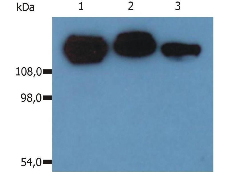 Western blotting: Recommended dilution: 2 μg/mL, positive control: JURKAT human leukemia T-cell lysate, Kg-1a human leukemia cell lysate, non-reducing conditions, 6 % separating gel, 4 % stacking gel.