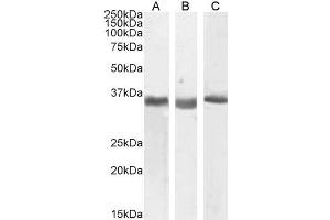 Western Blot: Approx 35-36 kDa band observed in Human, Mouse and Rat Kidney lysates, and in preliminary testing of A549 cell lysates (calculated MW of 35.8 kDa according to Human NP_036577.2,and 36.0 kDa according to Mouse NP_598664.3 and Rat NP_612542.1).
