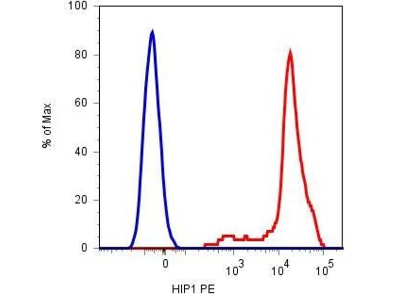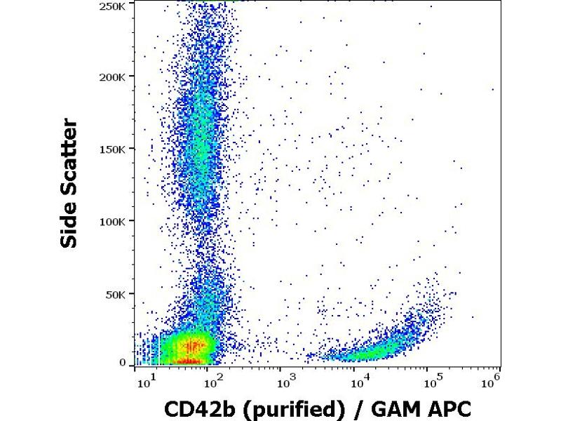 The antibody HIP1 reacts with an extracellular epitope of CD42b (GPIb alpha), a 135-145 kDa membrane glycoprotein expressed on platelets and megakaryocytes. CD42b and CD42c (GPIb beta) are composed in a disulfide linked heterodimer (CD42b/c, 160 kDa), CD42b/c forms a noncovalent complex with CD42a and CD42d.