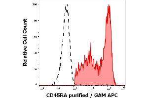 CD45RA is a high molecular weight isoform of a receptor-type protein tyrosine phosphatase, CD45 glycoprotein. CD45 is crucial in lymphocyte development and antigen signaling, serving as an important regulator of Src-family kinases, promotes cell survival by modulating integrin-mediated signal transduction pathway and is also involved in DNA fragmentation during apoptosis. CD45 isoforms differ in their extracellular domains, whereas they share identical transmembrane and cytoplasmic domains. These isoforms differ in their ability to translocate into the glycosphingolipid-enriched membrane domains and their expression depends on cell type and physiological state of the cell. CD45RA is expressed e.g. on naïve T cells and normal plasma cells.,PTPRCR, T200RA