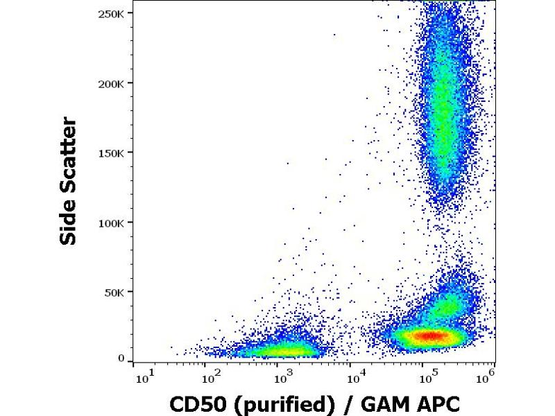 Intercellular adhesion molecule 3,CD50 (intracellular adhesion molecule 3, ICAM-3) is a transmembrane glycoprotein expressed by leukocytes, that serves as a counter-receptor for the lymphocyte function-associated antigen (LFA)-1 integrin. Besides functioning as an adhesive molecule that mediates e.g. the contact between T cells and antigen presenting cells, ICAM-3 regulates affinity of LFA-1 for ICAM-1 and induces T cell activation and proliferation. ICAM-3 plays an essential role in the initiation of the immune response both on T cells and antigen presenting cells and interacts also with CD209 (dendritic cell-specific ICAM-3-grabbing nonintegrin, DC-SIGN), a C-type lectin of dendritic cells and macrophages, this process is involved in dialogue between dendritic cells and granulocytes.,ICAM-3, ICAM-R