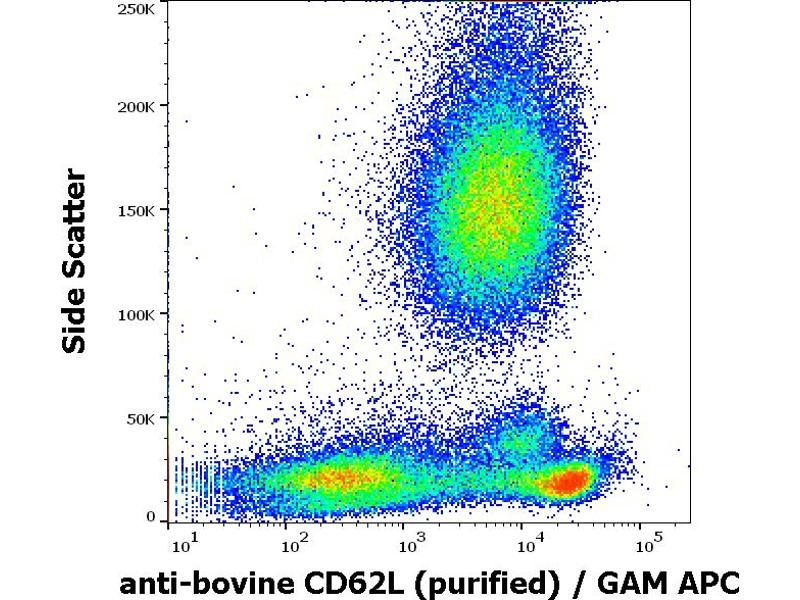 The antibody IVA94 reacts with an extracellular epitope of CD62L antigen (bovine). CD62L (L-selectin) is a 74-95 kDa single chain type I glycoprotein expressed on most peripheral blood B lymphocytes, T lymphocytes, monocytes and granulocytes, it is also present on a subset of NK cells and certain hematopoietic malignant cells.