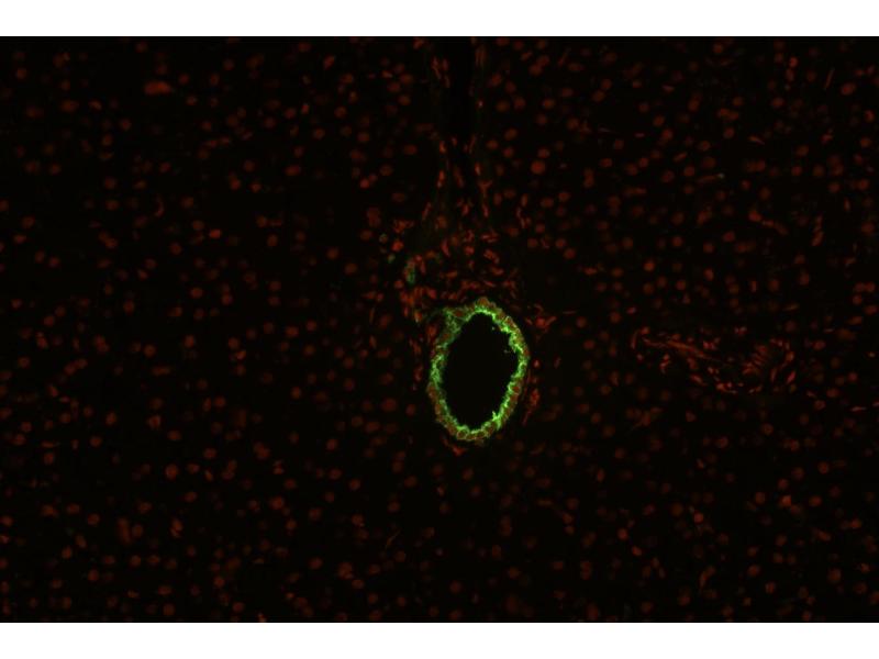 The antibody BA-17 reacts with cytokeratin 19 (40 kDa intracellular antigen) in human tissue. Cytokeratin 19 is not expressed in hepatocytes, it is often co-expressed with cytokeratin 7.